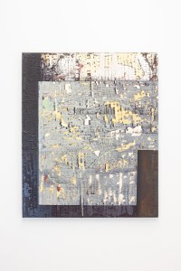Untitled 163, 2022. Coffee, ink, watercolour, oil, enamel, plaster on found panel. 900 x 740 mm